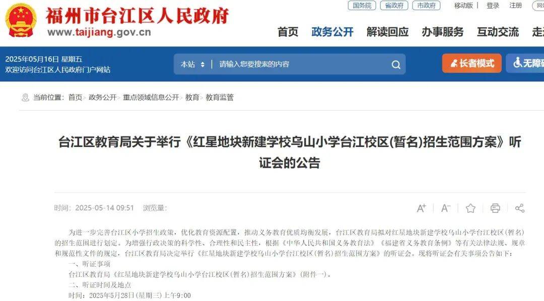 海西房产网(微信公众号:fjhxfcw)消息:2025年5月12日,台江区教育局发布“关于举行《红星地块新建学校乌山小学台江校区(暂名)招生范围方案》听证会的公告”。