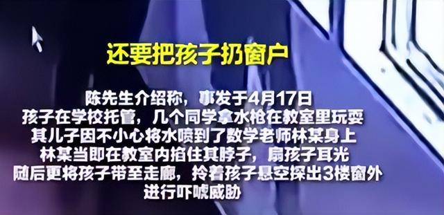 更让人愤怒的是,孩子爸爸陈先生第一时间向学校反映情况,结果换来的却是林老师已经道歉,学校也谈话批评了,就这?一个掐孩子脖子拎去窗外恐吓的老师,仅仅是道个歉,哪怕是成年人被人这么一吓都得心理创伤,更别说一个小学生。