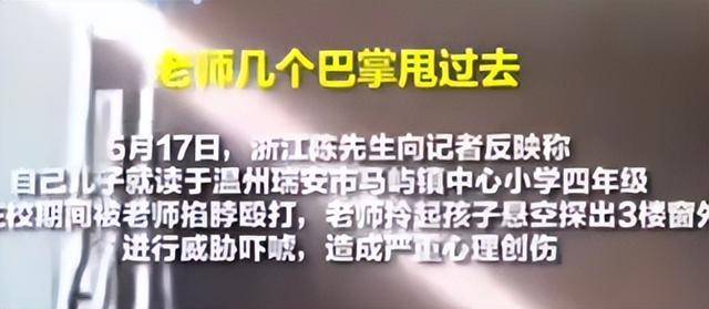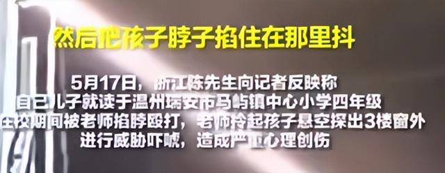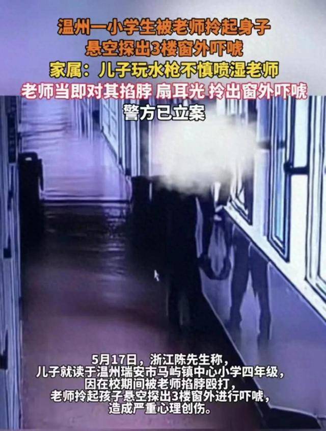 浙江的一个小学,一个四年级的小男孩,中午写完作业后和小伙伴玩水枪,不小心喷到了老师一身水。本来嘛这种事道个歉批评两句也就过去了,可没想到老师直接情绪爆炸,掐住孩子脖子,扇巴掌不说还把孩子从教室拽出去,拖到三楼的走廊上,一把拎到窗户外边!