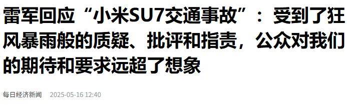 值得一提的是,就在5月16日,据多家媒体报道,在“我们小米人价值观大会”上,雷军正式回应此前小米SU7车祸事件,雷军表示,一场突如其来的交通事故把这一切都击碎了。我们受到了狂风暴雨般的质疑、批评和指责。这一场事故的影响如此之大,对我们小米的打击也如此之大。