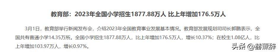 的确,从2023年数据来看,确实是这样,2023年全国小学招生人数来到1877万,刚好跟22年形成鲜明反比。
