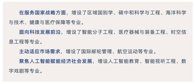 1、在服务国家战略方面:增设了区域国别学、碳中和科学与工程、海洋科学与技术、健康与医疗保障等专业。