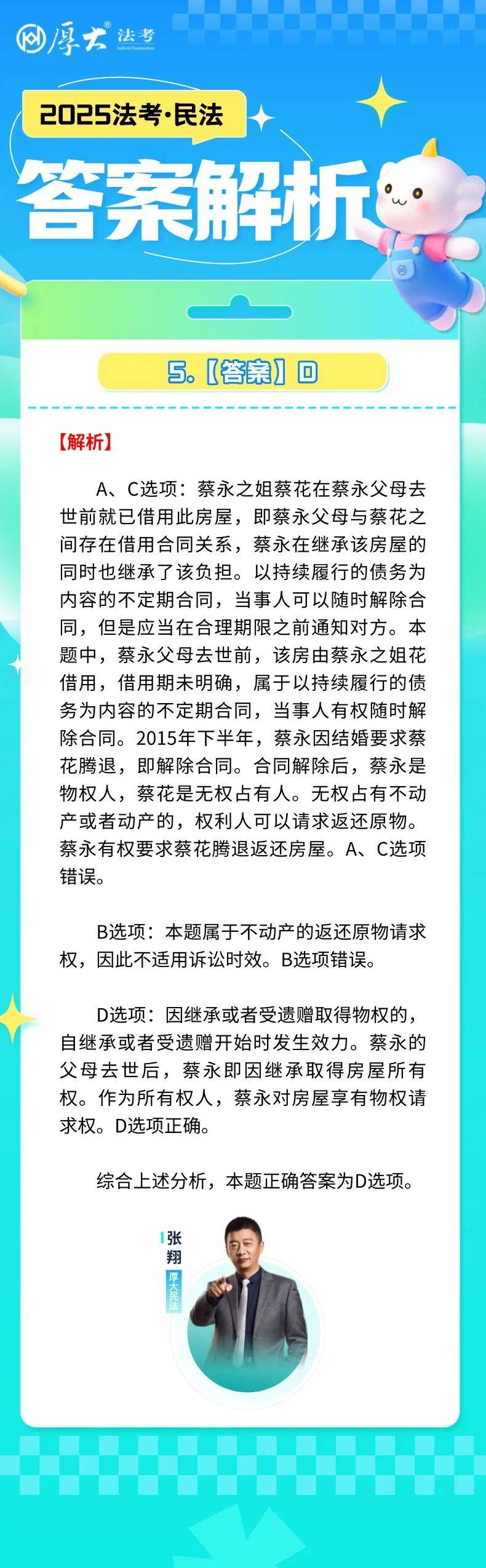 5、蔡永父母在共同遗嘱中表示,二人共有的某处房产由蔡永继承。蔡永父母去世前,该房由蔡永之姐蔡花借用,借用期未明确。2012年上半年,蔡永父母先后去世,蔡永一直未办理该房屋所有权变更登记,也未要求蔡花腾退。2015年下半年,蔡永因结婚要求蔡花腾退,蔡花拒绝搬出。对此,下列哪一选项是正确的?(2016/3/5)