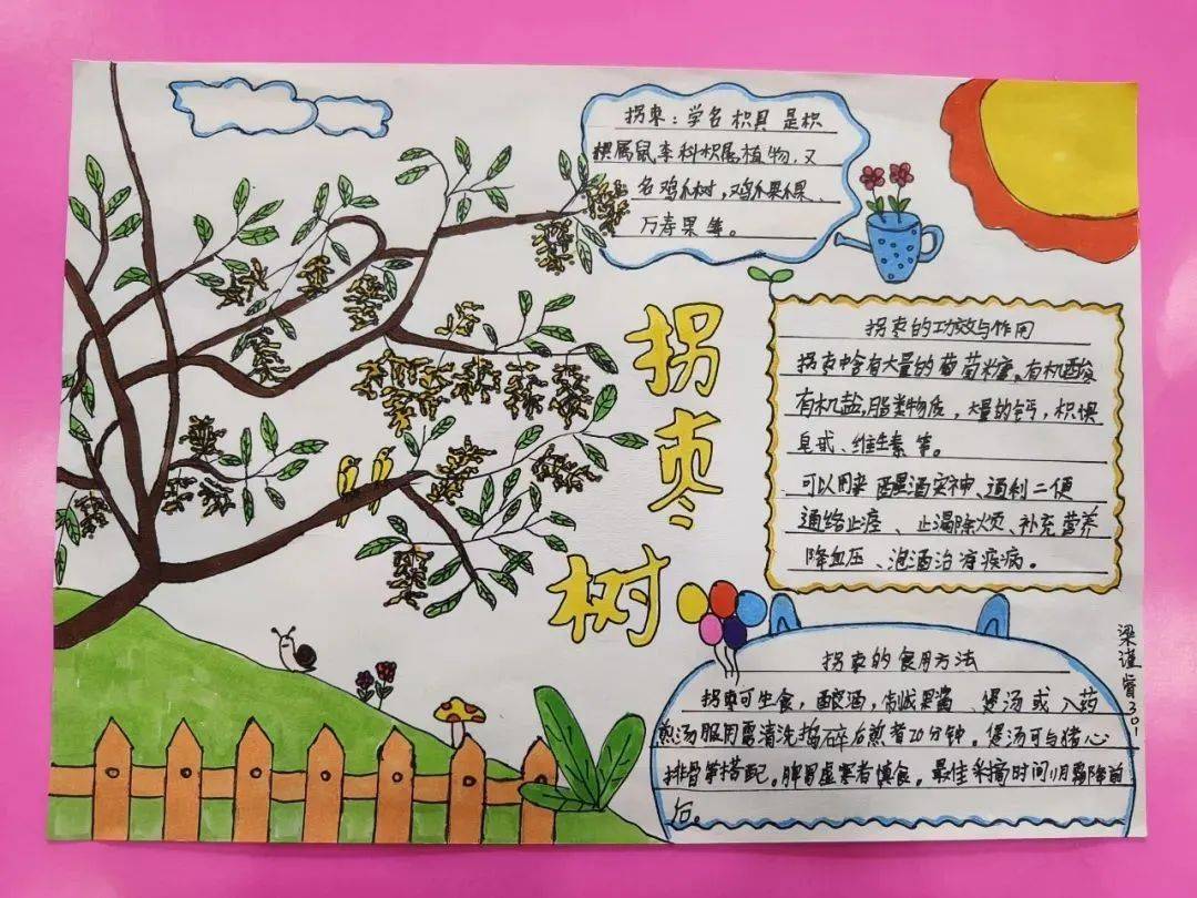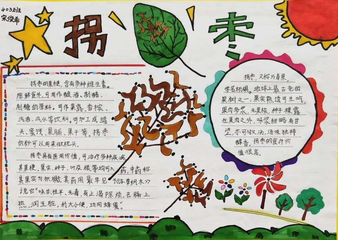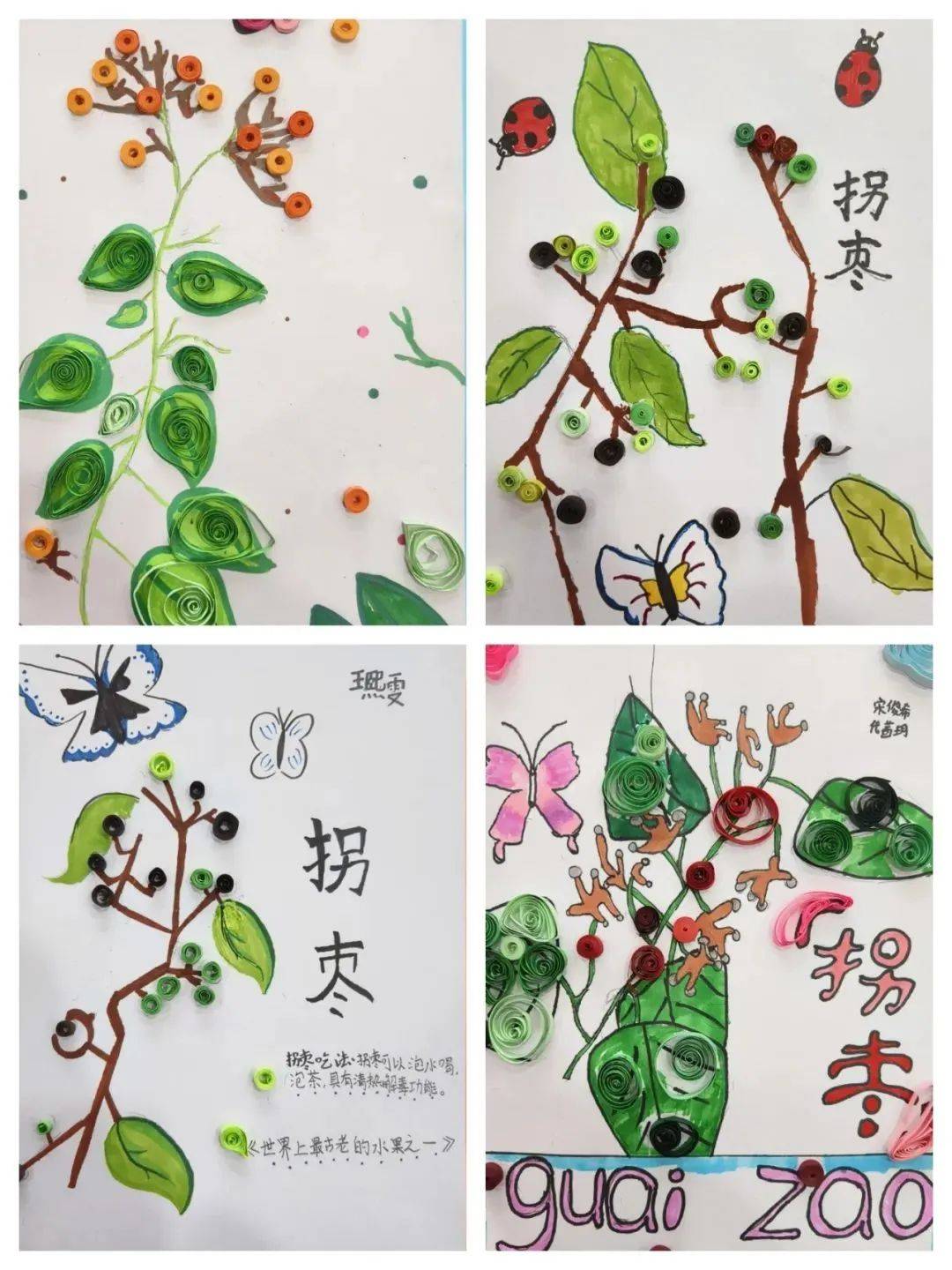 这些珍贵的手工作品和创作灵感最终被汇编成《东篱秋韵——拐枣树课程纪实》,书中不仅收录了孩子们的绘画、衍纸作品和手抄报,还附有科学小课堂、诗歌创作和校园采访实录,成为一本记录自然与成长的立体“美育日志”。它提醒着我们,当孩子们学会用艺术的眼光凝视一株曾被忽视的树,褶皱的树皮里便藏着岁月的诗行,蜷曲的果实中孕育着生命的密码。