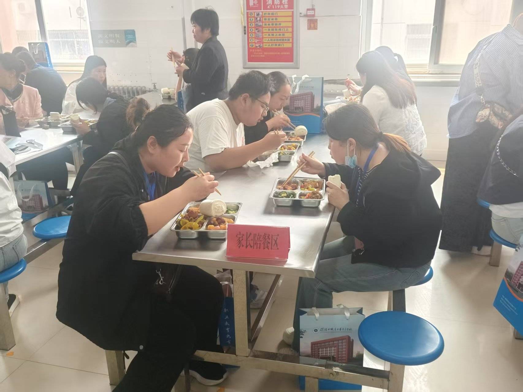 11:30,家长们走进餐厅用餐,通过与学生共同用餐,实际体验了饭菜质量及就餐环境,家长们对可口的饭菜与均衡营养给予了充分肯定和赞赏。