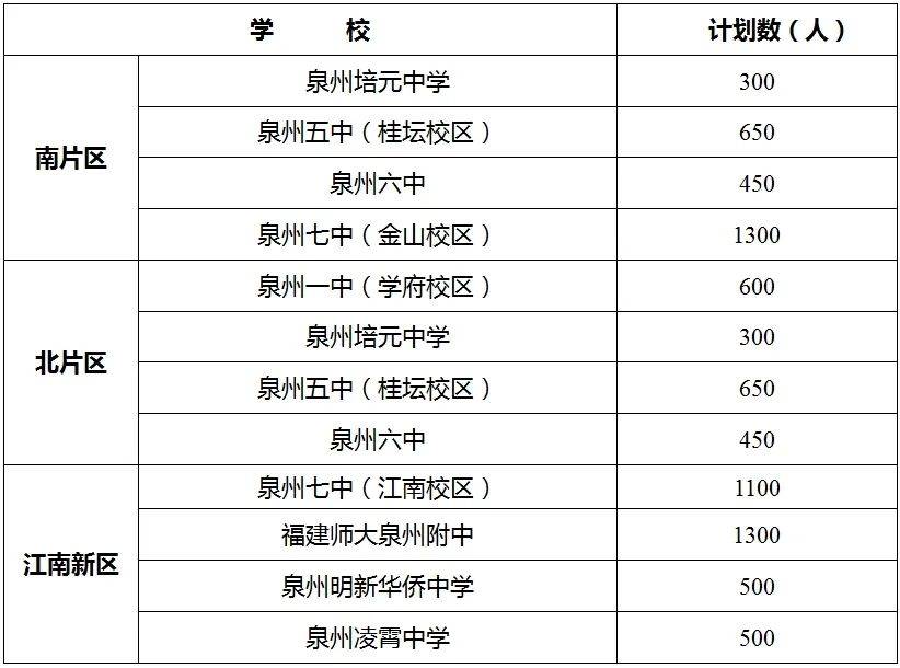 福建师大泉州附中和泉州七中(江南校区)实行免试、就近划片电脑派位升学的招生办法,招收泉州市新华中心小学、鲤城区培新中心小学、鲤城区新步实验小学、鲤城区实验小学(延陵校区)、泉州市金浦小学、泉州市黄石小学、泉州市中山陶英小学、鲤城区第三实验小学总校、鲤城区第二实验小学和泉州实验中学鲤城附属学校小学部等10所小学的毕业生,及户籍关系在福建师大泉州附中和鲤城区第三实验小学总校招生服务片区的“回原籍学生”。