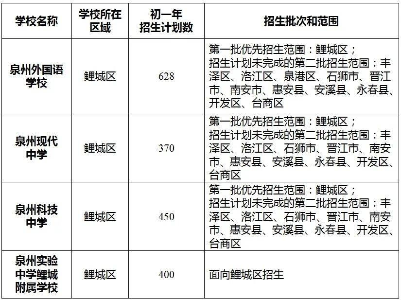 第一批:泉州外国语学校、泉州现代中学、泉州科技中学和泉州实验中学鲤城附属学校面向鲤城区招收具有鲤城户籍或学籍的小学应届毕业生。