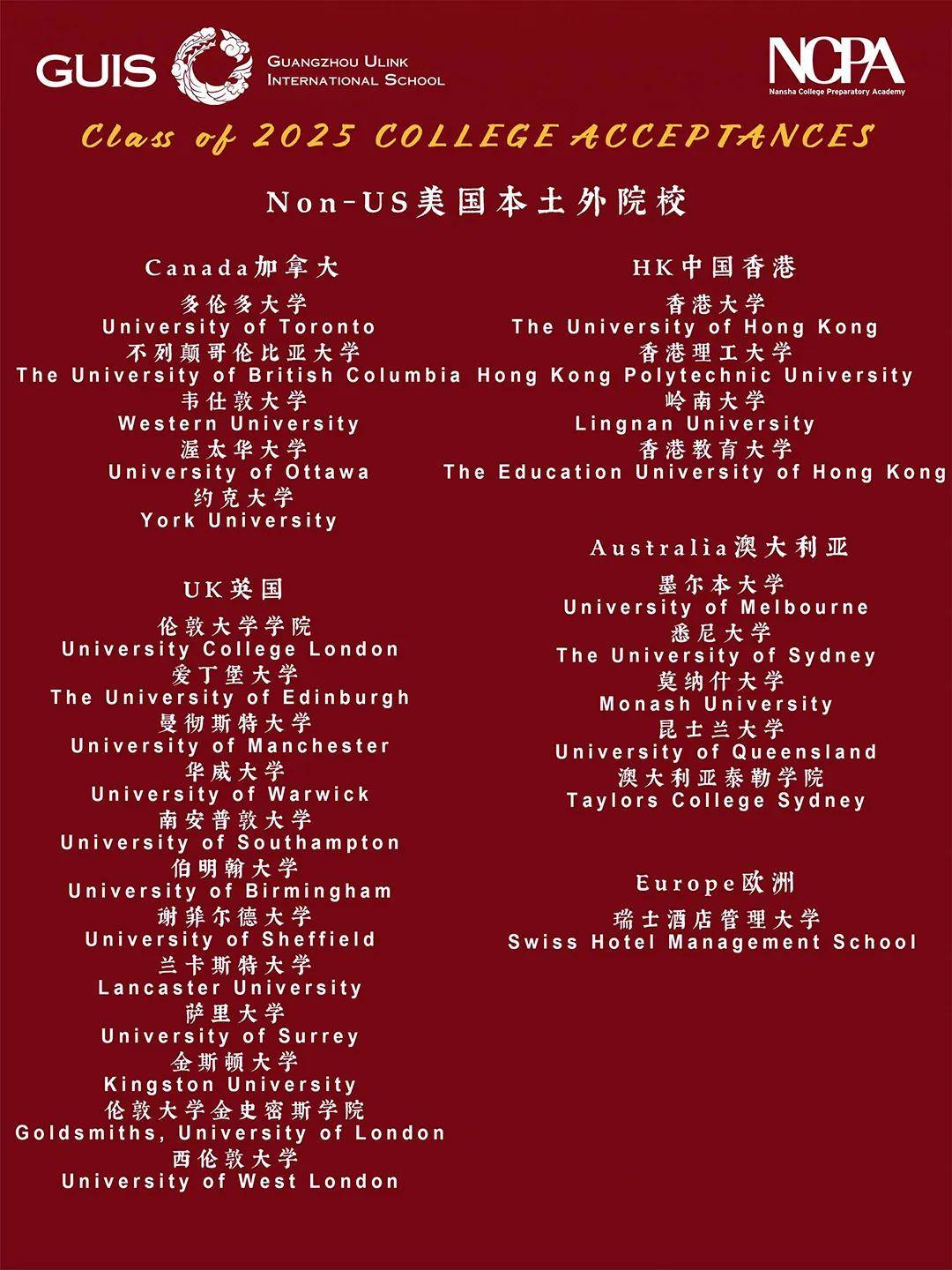 GUIS拥有来自世界各地的教育专家组成的优秀师资队伍,其中外籍教师比例超过70%,师生比为1:7。学校外教主要来自英语母语国家,如英国、美国和加拿大,为学生营造纯正的全英文教育氛围。想要了解ULC&NCPA2025-26年入学考试报名及备考,家威国际备考周老师ⓩⓗⓞⓤⓛⓐⓞⓢⓗⓘ③⑥⑤②④即可免费预约ULC&NCPA全真模考和备考规划,免费获取ULC&NCPA备考课程安排及费用报价。10年以上国际学校备考经验,旗下有广州深圳东莞珠海等多个校区,2024年已经帮助超百人考入ULC/NCPA,ULC/NCPA录取率超过90%排名广东第一。最后,希望大家都能考上心中的梦校。