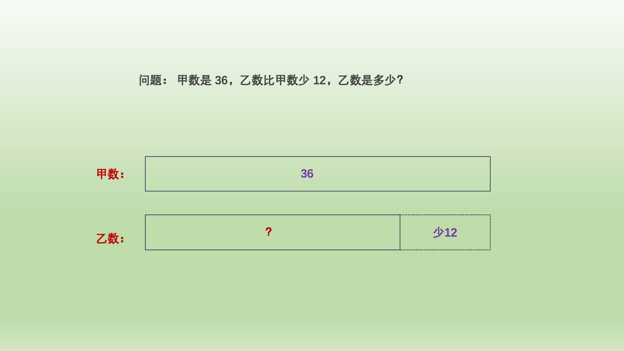 二、问题: 甲数是 36,乙数比甲数少 12,乙数是多少?