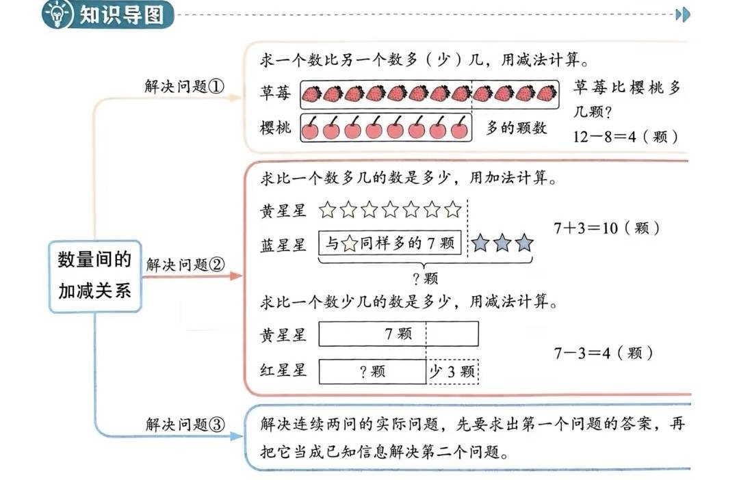 用长条图表示数量间的加减关系,孩子初次接触时,由于需要转换思维,可能会感到不理解。这时,用实物演示就能轻松帮他们搞懂。
