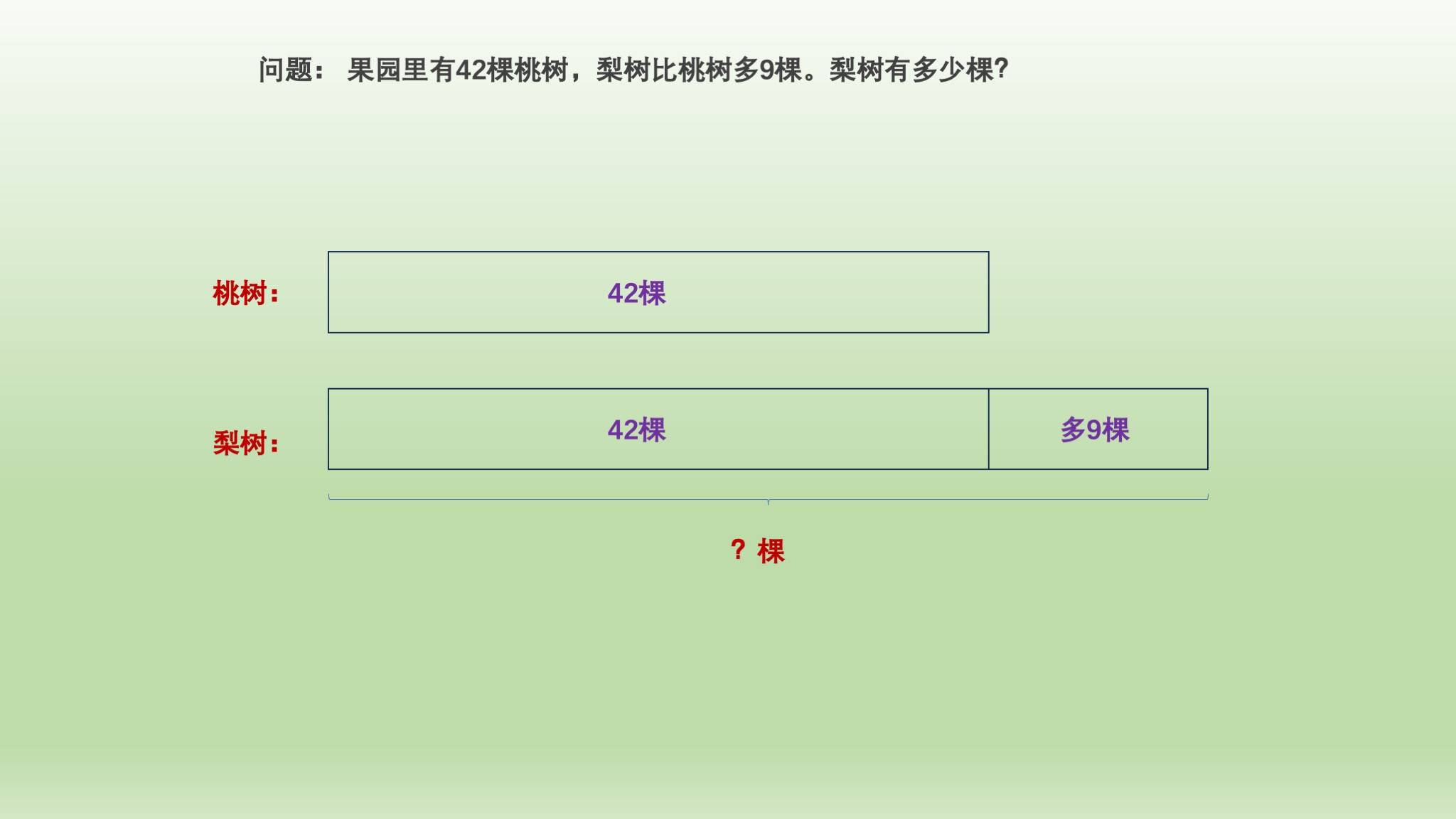 一、问题: 果园里有42棵桃树,梨树比桃树多9棵。梨树有多少棵?