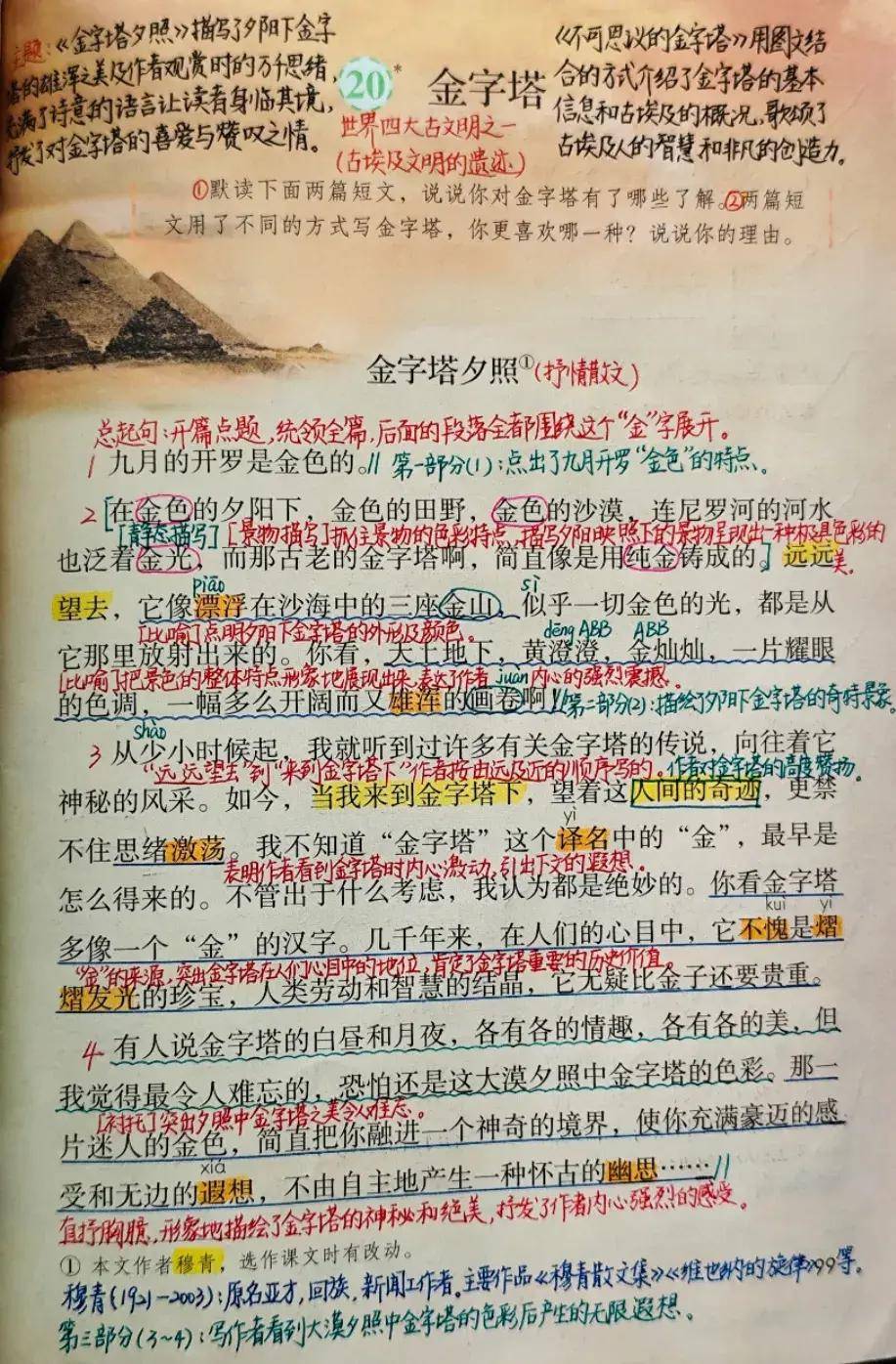 比如《金字塔夕照》中“在金色的夕阳下,金色的田野,金色的沙漠,连尼罗河的河水也泛着金光,而那古老的金字塔啊,简直像是用纯金铸成的。”这个句子连用了几个金色的事物,描绘出了金字塔沐浴在金色世界里的景象。