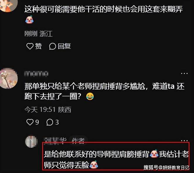 这个女生当时就哭笑不得,说现在早就不流行这一套了,跟老师献殷勤其实没什么用,老师的人脉圈子是学生永远触及不到的,老师并不会因为学生这种谄媚之举就会对学生格外放宽毕业条件。所以说如今的孩子确实看透了很多现实,不过仍然有一些同学在献殷勤的这条路上走偏了,进而伤了自己。