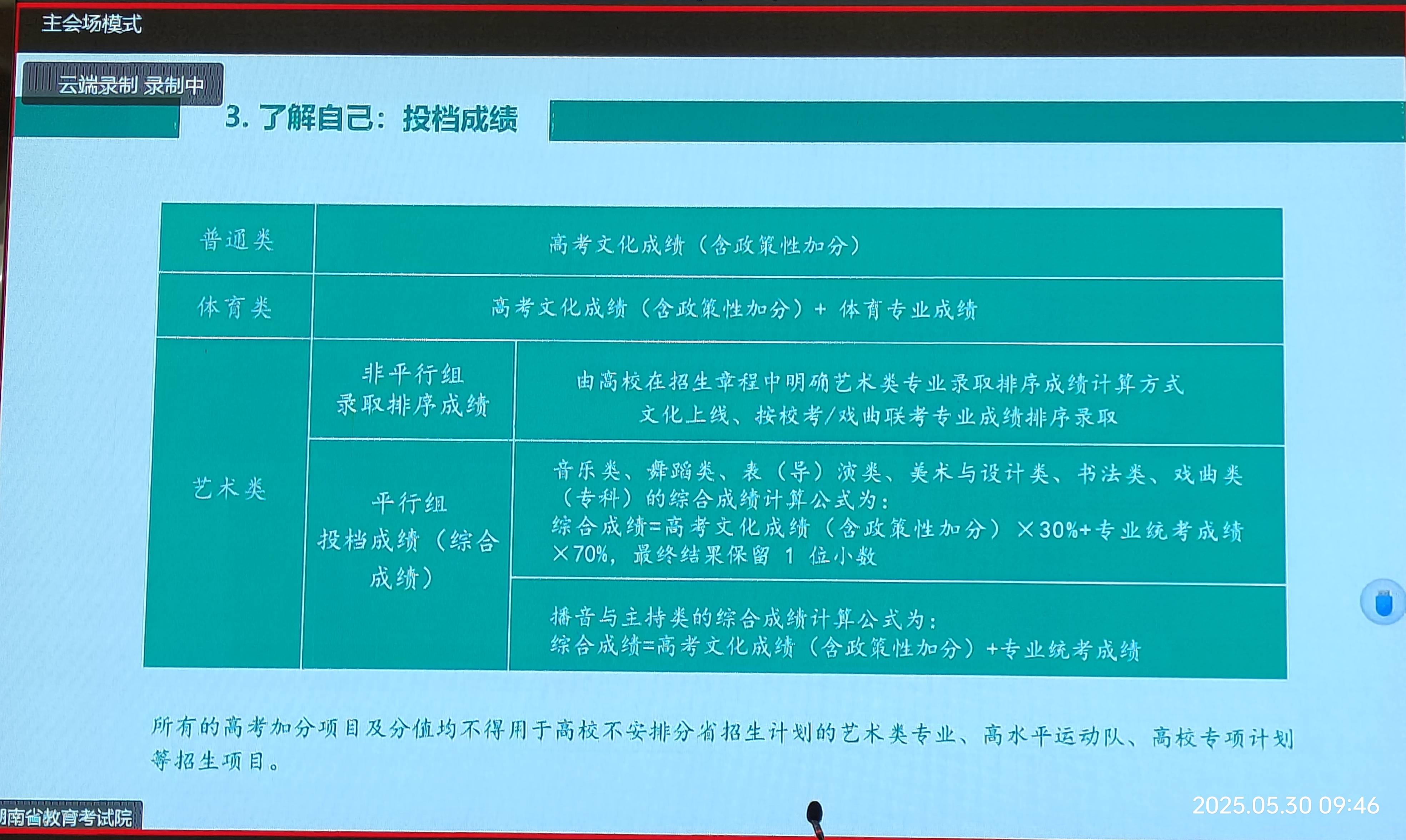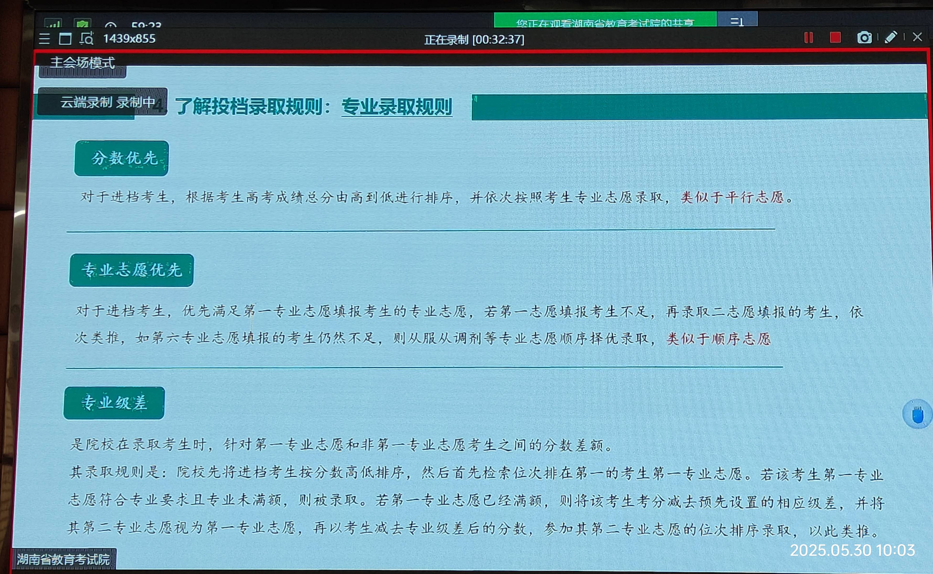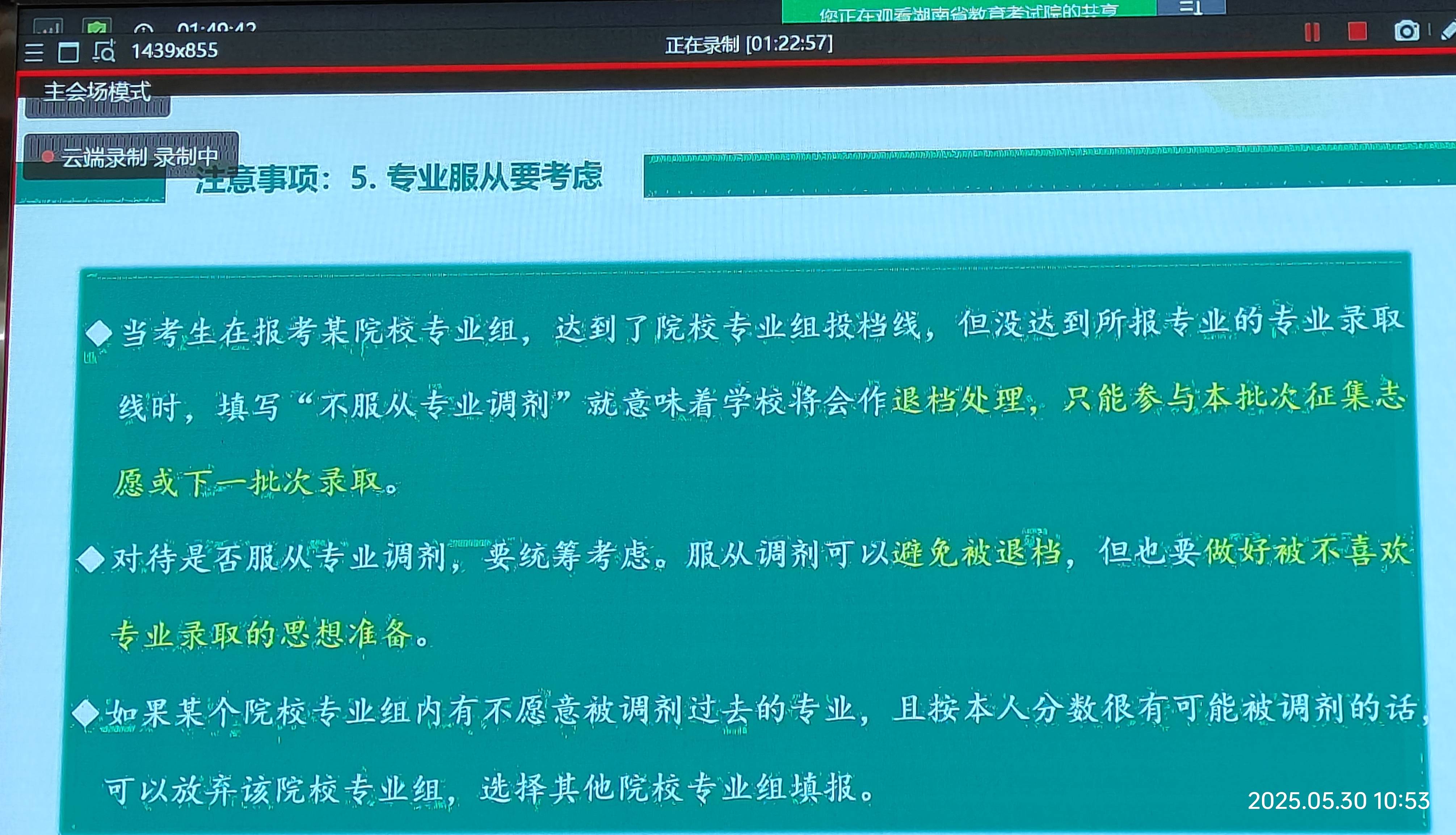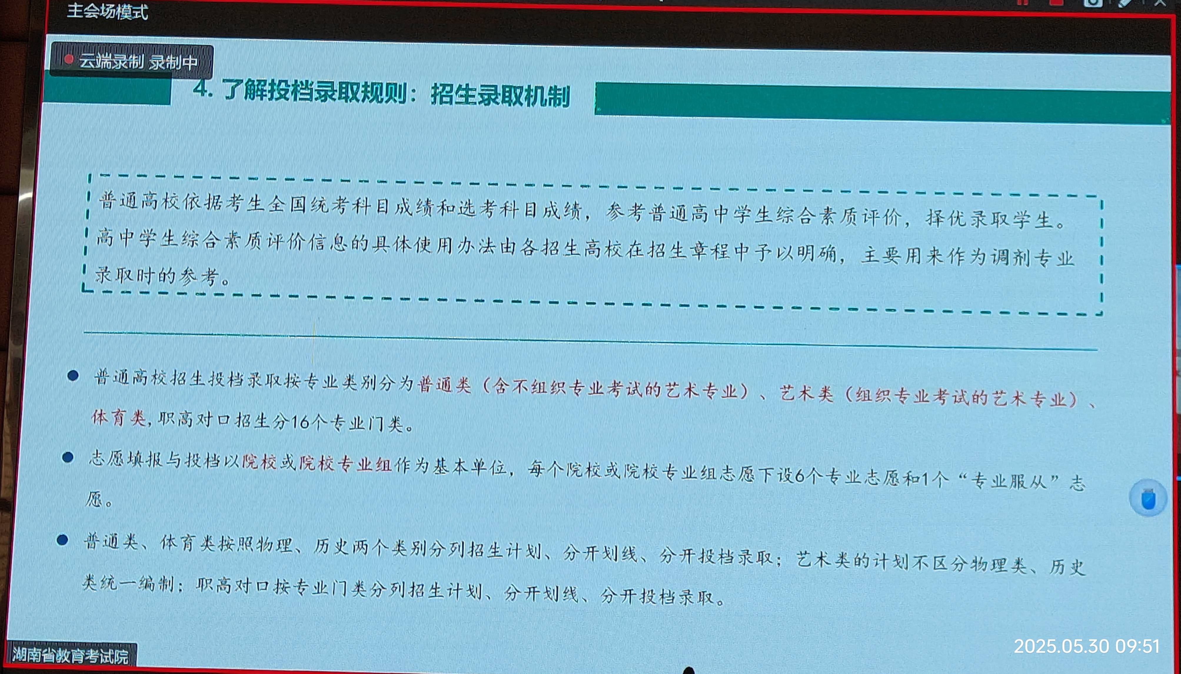 今天(2025-5-30)上午9:30,本届高三班主任及有关领导集中在报告厅听会,主题是:“2025年HN高考政策解读与志愿填报”,凡是既定了的值得广而告之的都和盘托出。记笔记是赶不上节凑,用手机拍摄是最好的学习方式。这里原本推出,共本届高三学子参考使用,尤其是高考后,特别是高考出成绩后,填报志愿是“刚需”。