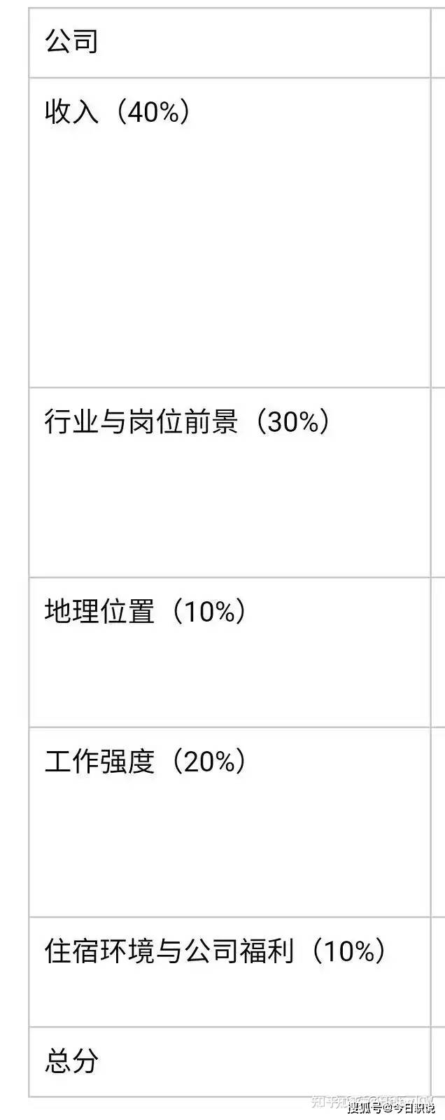 这是我最后挑选公司的时候,各项指标在我心里的权重,你们可以按照这个给公司打分。