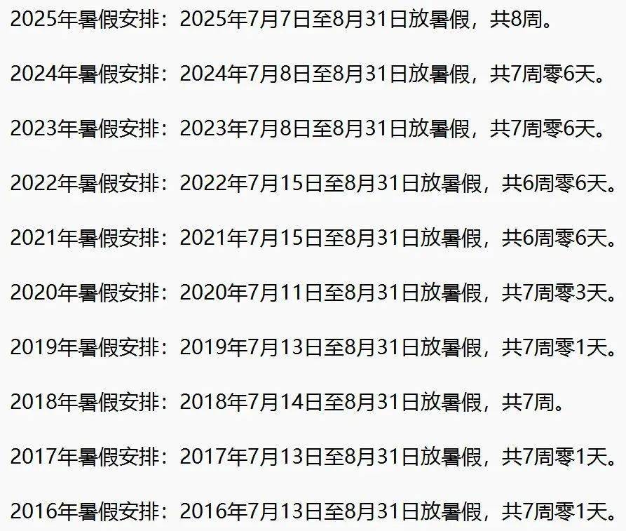据了解,北京中小学的暑假时长,前些年稳定在7周左右。2023年、2024年连续两年,中小学暑假时长接近8周,而今年的暑假时间又增加了1天,称得上是 十年来最长暑假。
