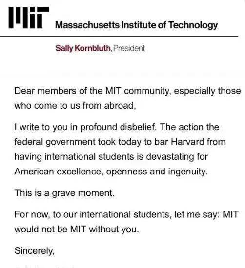 "亲爱的麻省理工学院成员,特别是那些从国外来到我们这里的成员。联邦政府今天采取的禁止哈佛招收国际学生的行动,对美国的卓越、开放和独创性是毁灭性的。这是一个严峻的时刻。现在,请允许我对我们的留学生说: 没有你们,就没有麻省理工学院。"