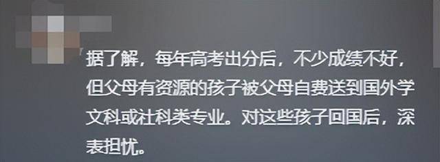 还有网友认为,不参加国内高考的基本都是成绩非常不好的,但是家里父母都比较有资源,就会把孩子送出国学习文科或者社科类专业。