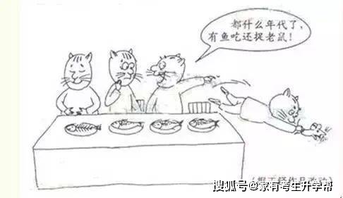 餐桌,许多猫吃鱼,就一只猫捉老鼠,别的猫说:“有鱼吃还捉老鼠?”