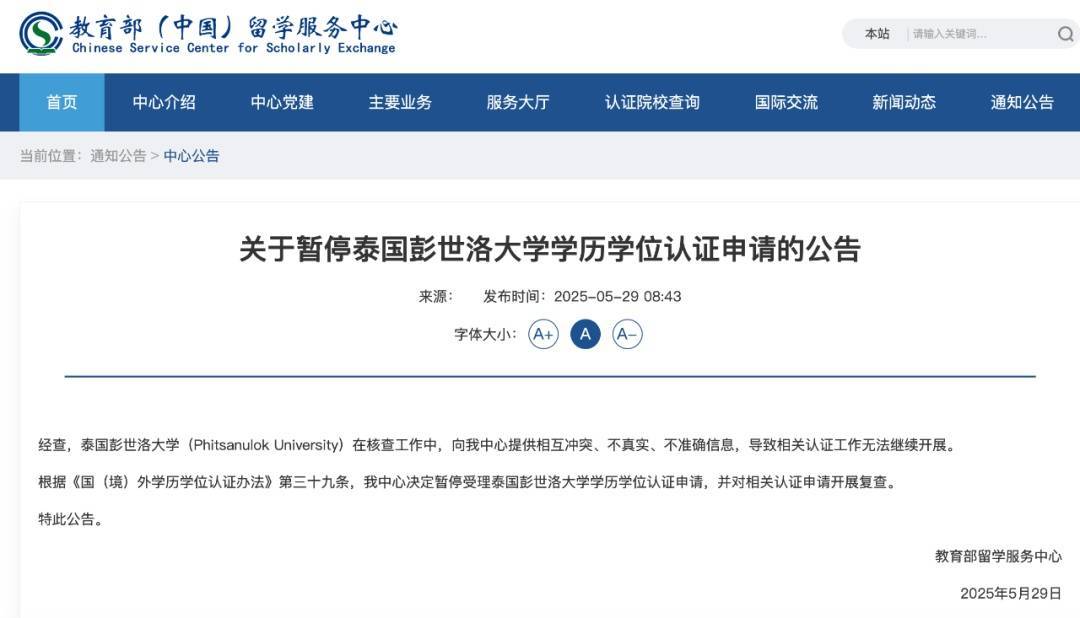 5月29日,教育部(中国)留学服务中心发布《关于暂停泰国彭世洛大学学历学位认证申请的公告》:经查,泰国彭世洛大学(Phitsanulok University)在核查工作中,向我中心提供相互冲突、不真实、不准确信息,导致相关认证工作无法继续开展。