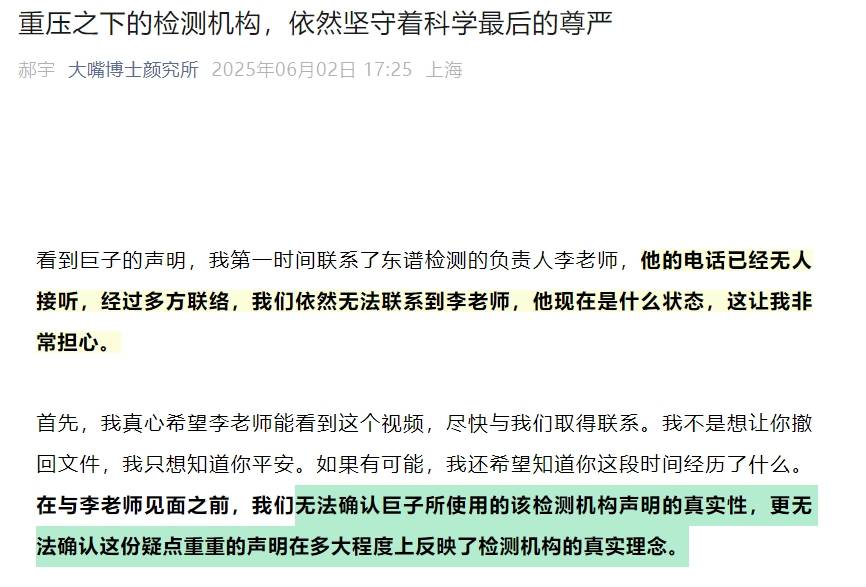 6月2日,知名大V大嘴博士再度发文“炮轰”巨子生物,剑指巨子生物对其合作的检测机构施压;同时表示,自己已联系不到当时负责检测的负责人。