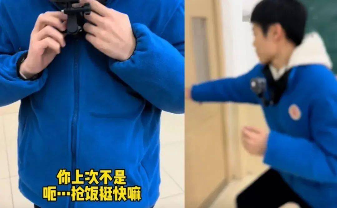 在学校当老师的网友@JR,注意到班上有位男生抢饭速度惊人后把运动相机带去了学校,临近下课时给男生装上。