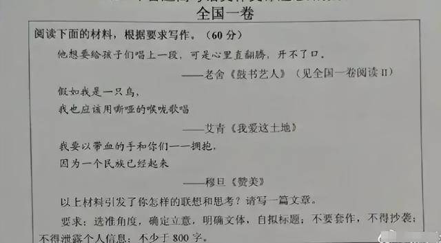 全国一卷的作文题让人眼前一亮,三段材料分别来自老舍、艾青和穆旦,都与抗战有关。