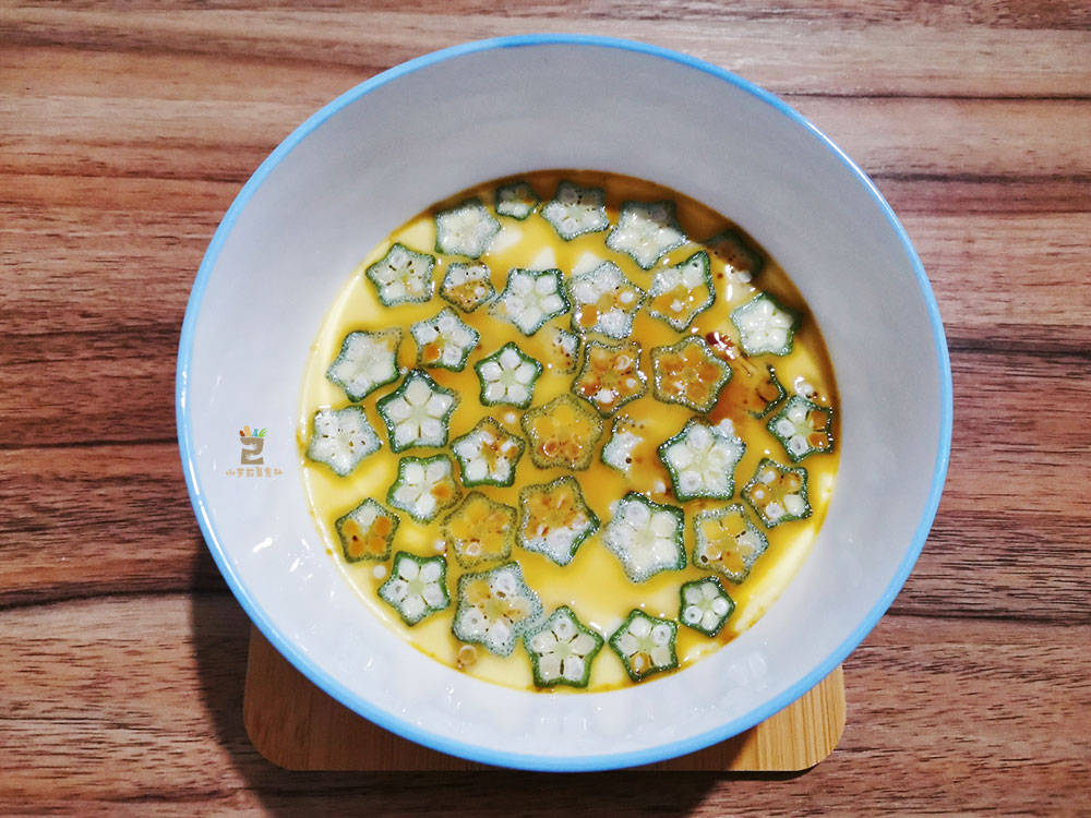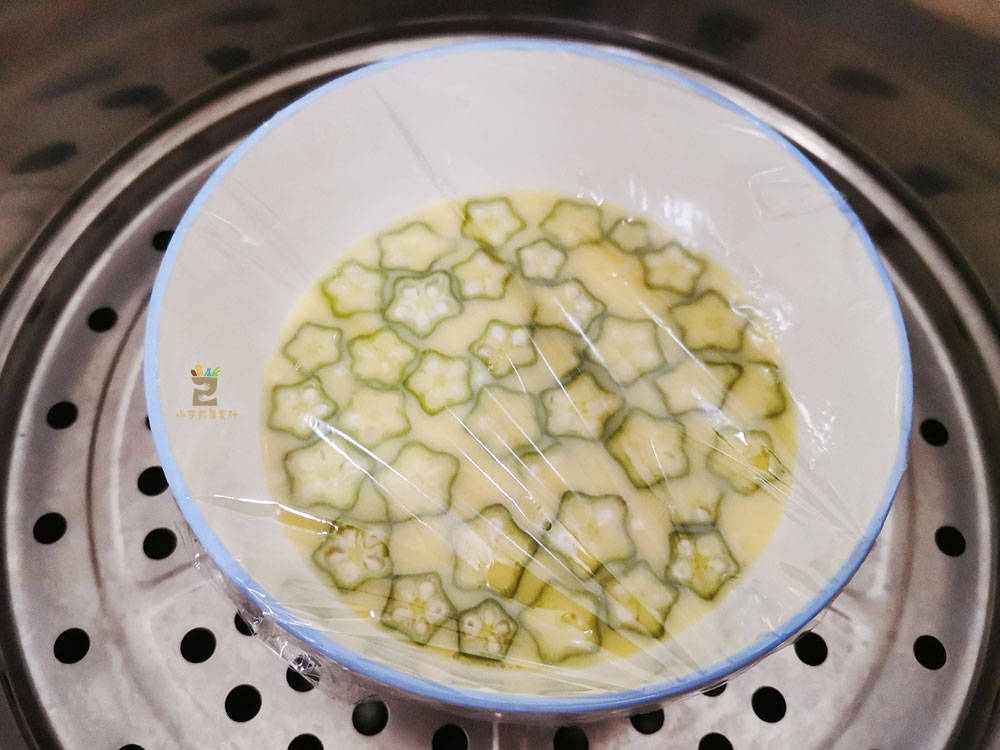 3、如果希望口感更细滑的可以把蛋液过两遍滤筛。秋葵直接放到蛋液里边即可。