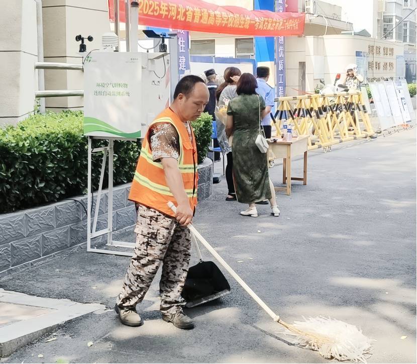 当高考的号角在晨曦中吹响,有一群身着橙黄色工作服的身影,已在考点外默默忙碌,用汗水编织出考场周边的洁净画卷。他们仔细清扫着考点周边的地面,不放过一片落叶、一个烟头,为考生们清扫出一片明净的“起跑线。环卫工人张大哥说:“考点今天可不能有杂物,得让孩子们看着舒舒服服的。” 说这些话的时候,张大哥那橘色的工作服在阳光下泛着温暖的光。