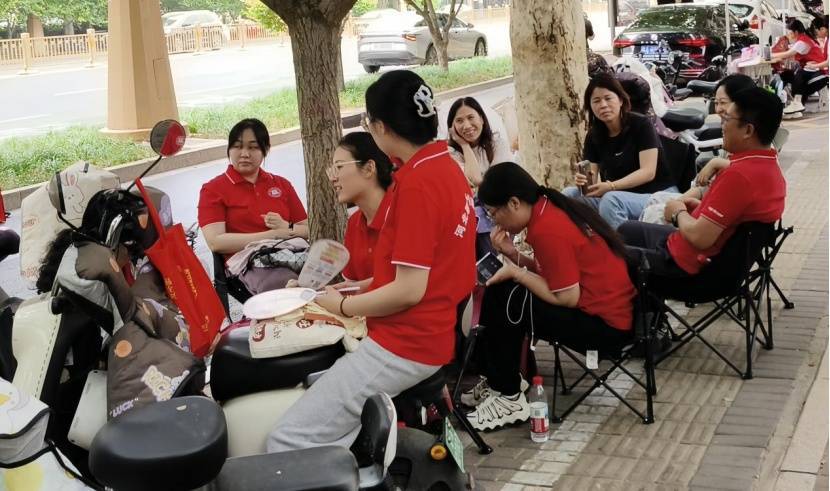家长们是考场外最庞大的群体,他们的眼神中满是关切与期待,有的家长还特意穿上了寓意“旗开得胜”的旗袍,手持向日葵,希望孩子“一举夺魁”。更多的家长或是互相交流孩子的备考情况,或默默在心里为孩子加油鼓劲儿,家长们就这样静静地守在考场外,用无声的陪伴给予孩子前进的力量。