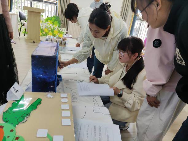 在作品介绍环节,各班教师依次上台,结合实物演示等方式,详细讲解玩教具的设计理念、玩法规则及教育价值。评审团成员不时就材料安全性、游戏延展性等问题与教师互动交流,现场氛围热烈而富有专业性。