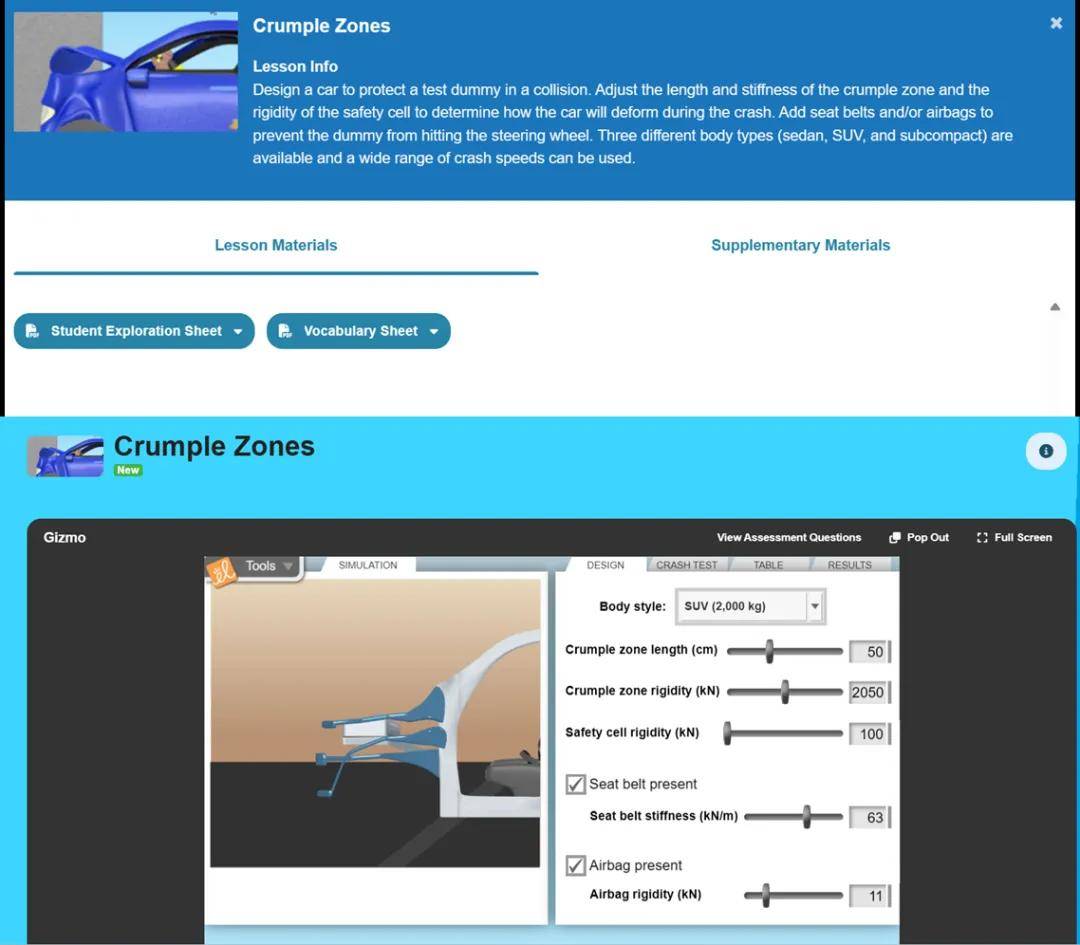这些模拟器将抽象的知识转化为直观的互动体验,帮助学生理解复杂概念。例如,前文提到汽车防撞系统的物理题,Gizmos也提供了相关的模拟器帮助学生学习动量守恒和冲量原理,从而更好地理解碰撞过程中力的作用和能量转换。