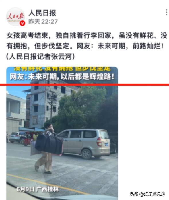 鲜花、手机、礼物,这些既是家长对孩子的鼓励,也是一种嘉奖,可与之形成鲜明对比的,是广西桂林一名女生,在高考结束后独自挑着行李回家。