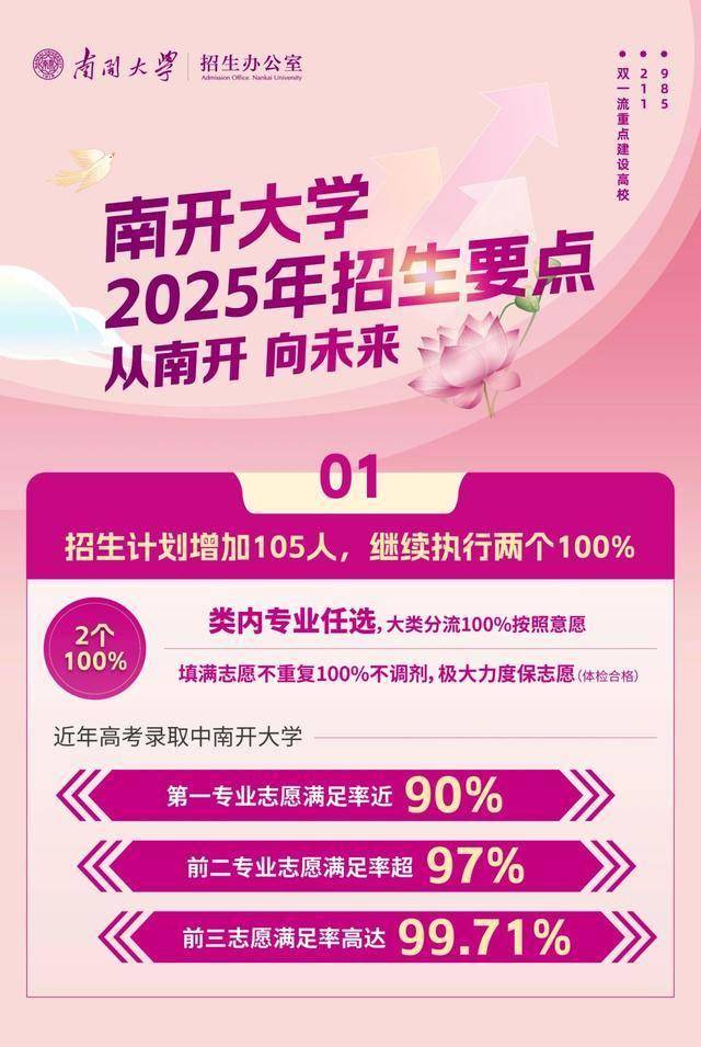 2025年,南开大学招生计划增加105人,继续执行两个100%,即类内专业任选,大类分流100%按照意愿;填满志愿不重复100%不调剂,极大力度保志愿(体检合格)。