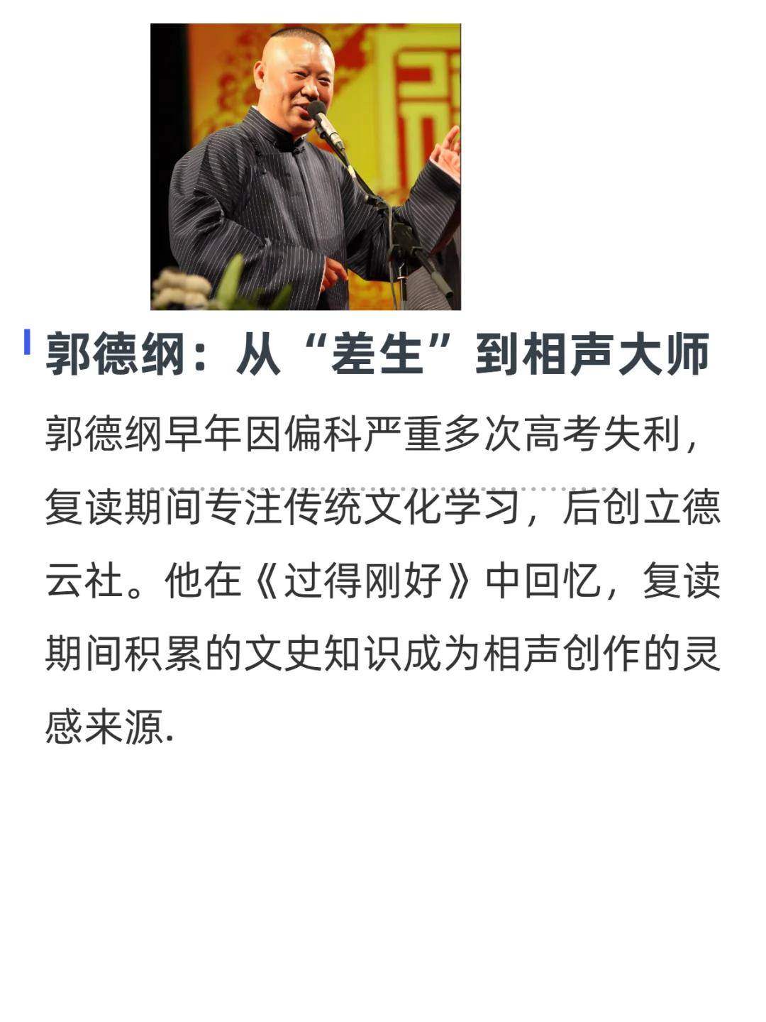 复读时狂补文史知识,德云社的每段经典相声,都藏着他在书堆里 “偷” 来的灵感。