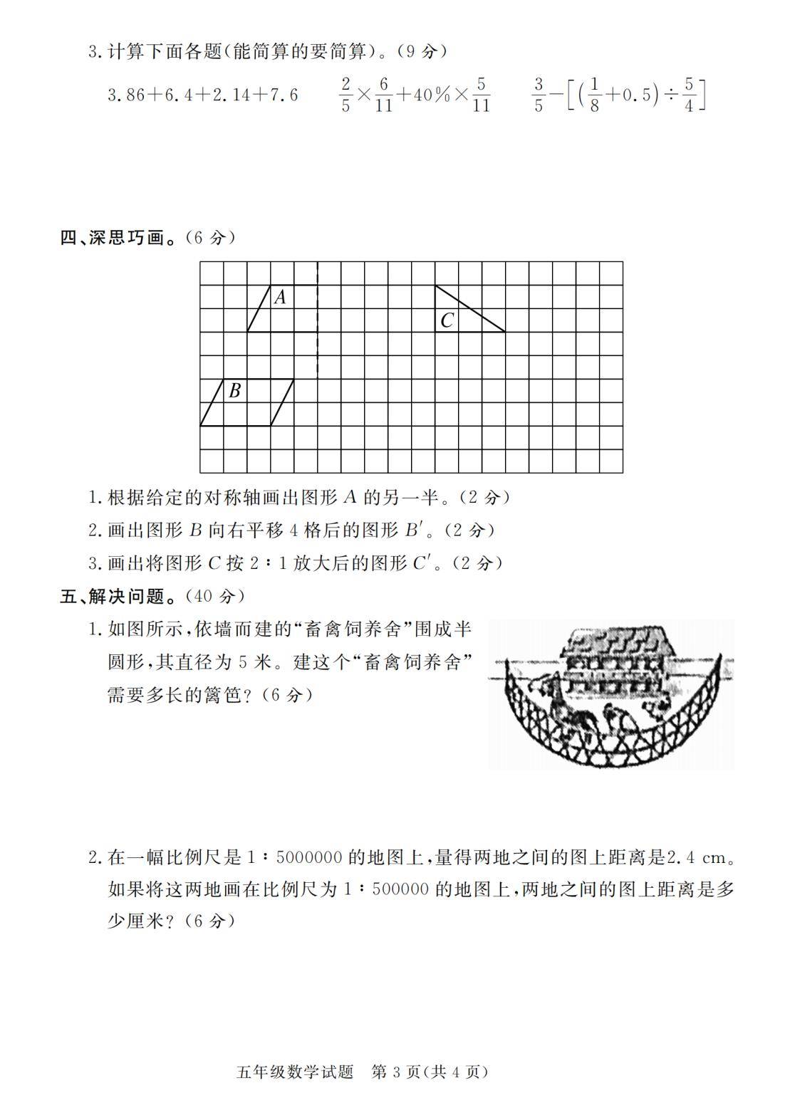 今天为大家分享:【期末摸底测试】2024-2025学年五年级数学下册期末摸底测试卷[54],分填一填、选一选、算一算、深思巧画、解决问题板块。涵盖数的读写、比例、几何图形(圆、圆柱、圆锥、对称平移放大 )、运算(简算、方程 )、实际应用(行程、比例尺、黄金比、容器体积 )等五年级下册数学知识 。