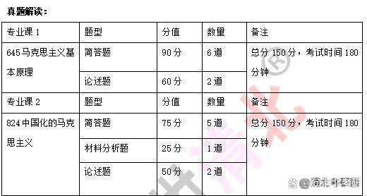 专业课 2 是 824 中国化的马克思主义,同样 180 分钟,总分 150 分。该科目题型更为多样,5 道简答题共 75 分,考查考生对知识的系统认知;1 道 25 分的材料分析题,注重考察考生的实际应用与分析能力;2 道论述题合计 50 分,对考生的理论深度与综合能力提出高要求。