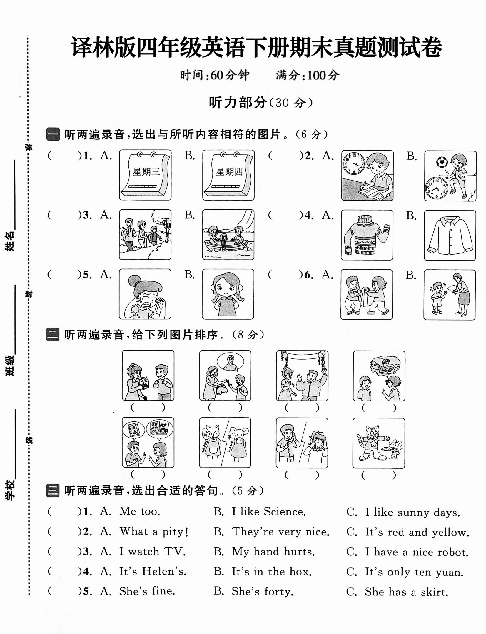 听力作为英语学习的重要板块,这套试卷的听力题设计巧妙。图片匹配题需要孩子边听边快速抓取关键信息,像星期、活动场景等,考验听力敏锐度;排序题则更注重对内容逻辑的梳理,得跟上录音节奏,理清事件顺序;答句选择和连线题,还融入了语境理解,让孩子不光听单词,更要懂语义、会运用,全方位锻炼听力技能 。