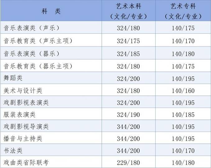按照教育部规定,组织校考的高校艺术类专业,考生高考文化课成绩不低于普通类专业批次相应科类录取控制分数线。具体高考文化课成绩、破格录取等要求,按高校规定执行。专业录取控制分数线由院校自行确定并要求相应类别专业统考合格。