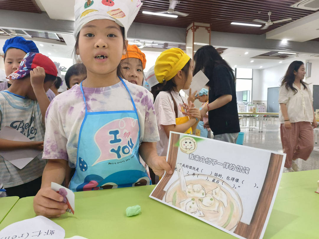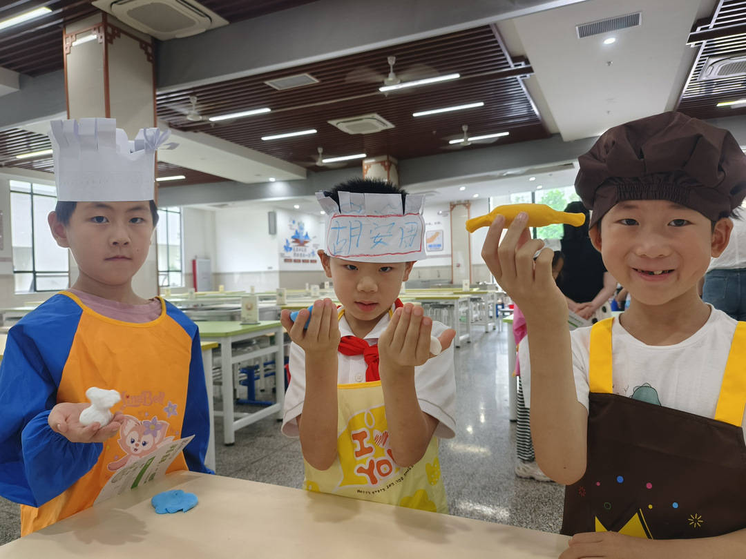一年级的孩子们带着满满的兴奋投入其中,瞪圆眼睛,手掌用力压,将橡皮泥尽可能推压成薄片,再轻轻地将提前写好的祝福纸条作为“馅料”包进“馄饨”中:“祝妈妈夏天快乐!”“我想成为数学小达人!”……
