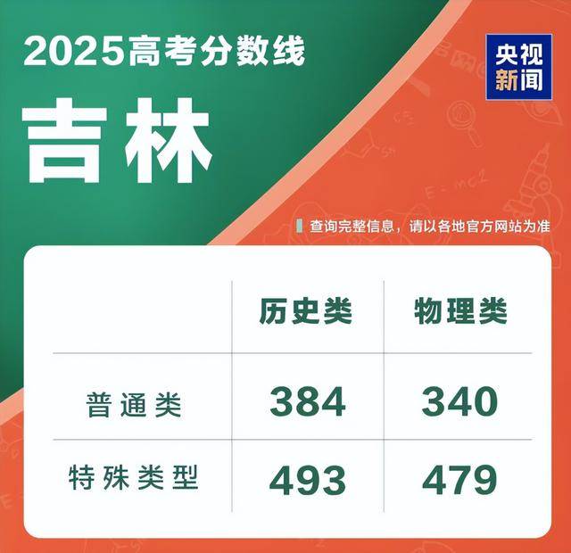 今年吉林普通类历史学科组分数线为384分,物理学科组分数线为340分。