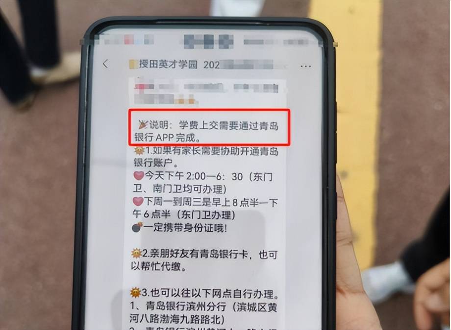 学生家长是在学校班级群里陆续收到新学年学费收取通知的,但是这次要求学费上交需要通过青岛银行APP完成。可以在该校内门卫处办理银行卡,开通银行账户。当然,也可以找有青岛银行卡的亲朋好友进行代缴,或者自行去青岛银行网点办理银行卡。