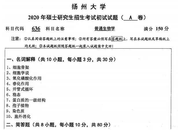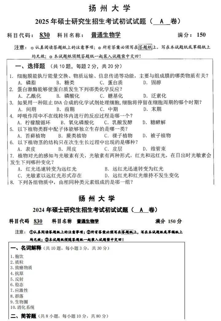 2014-2025年扬州大学830普通生物学(原636)考研真题试卷【不含答案】