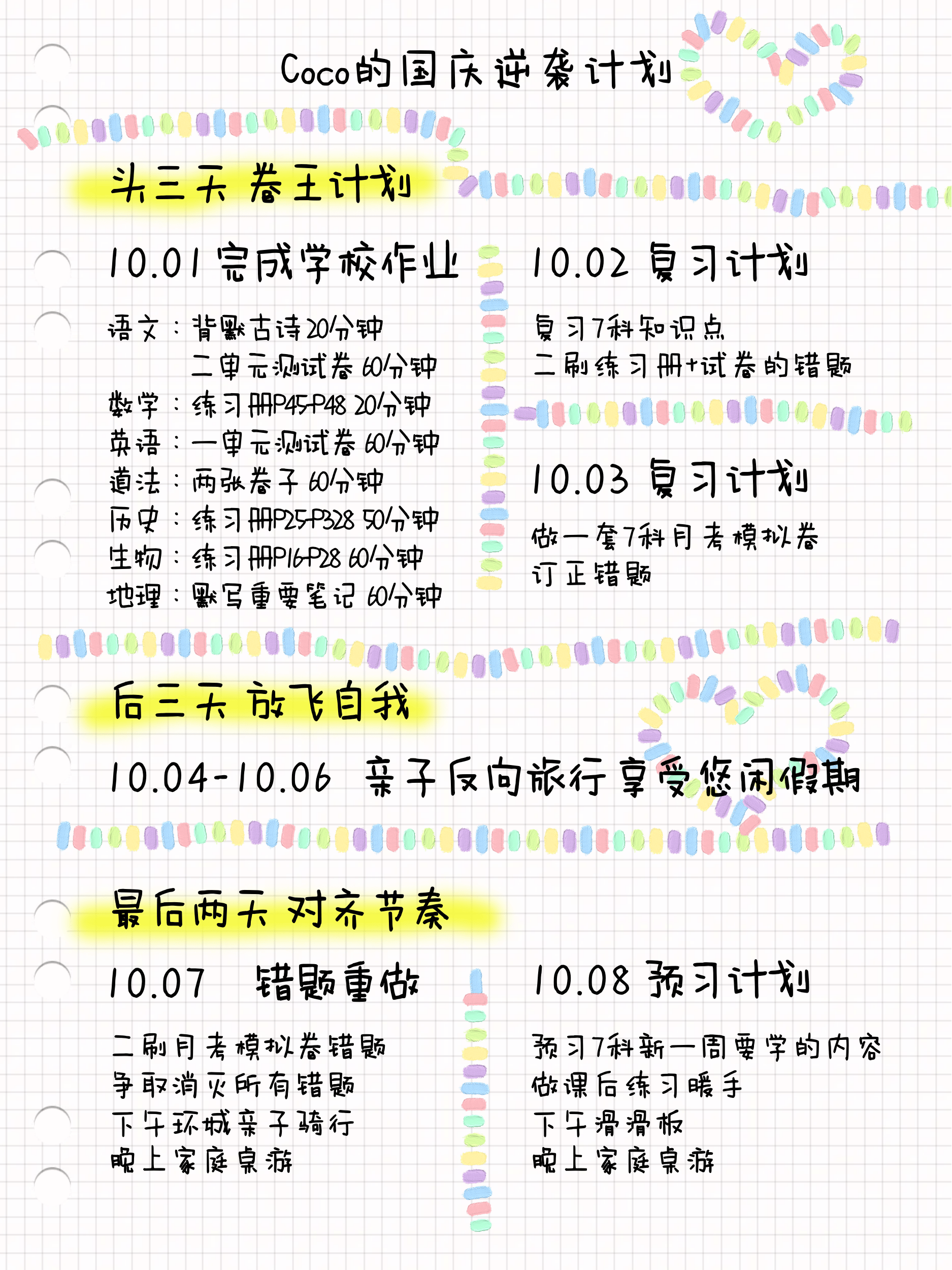 国庆长假第一天,Coco就拿着计划表来找我了,说他自己已经安排好了《国庆逆袭计划》!