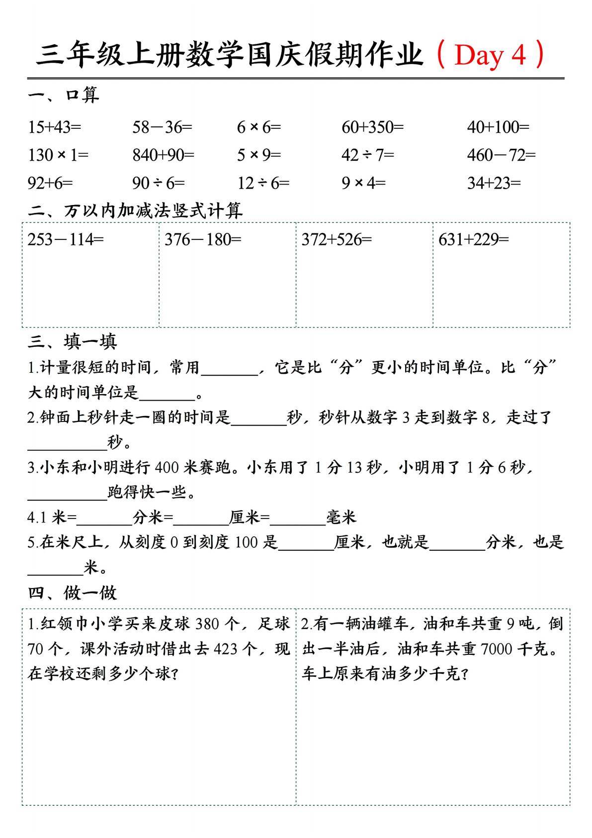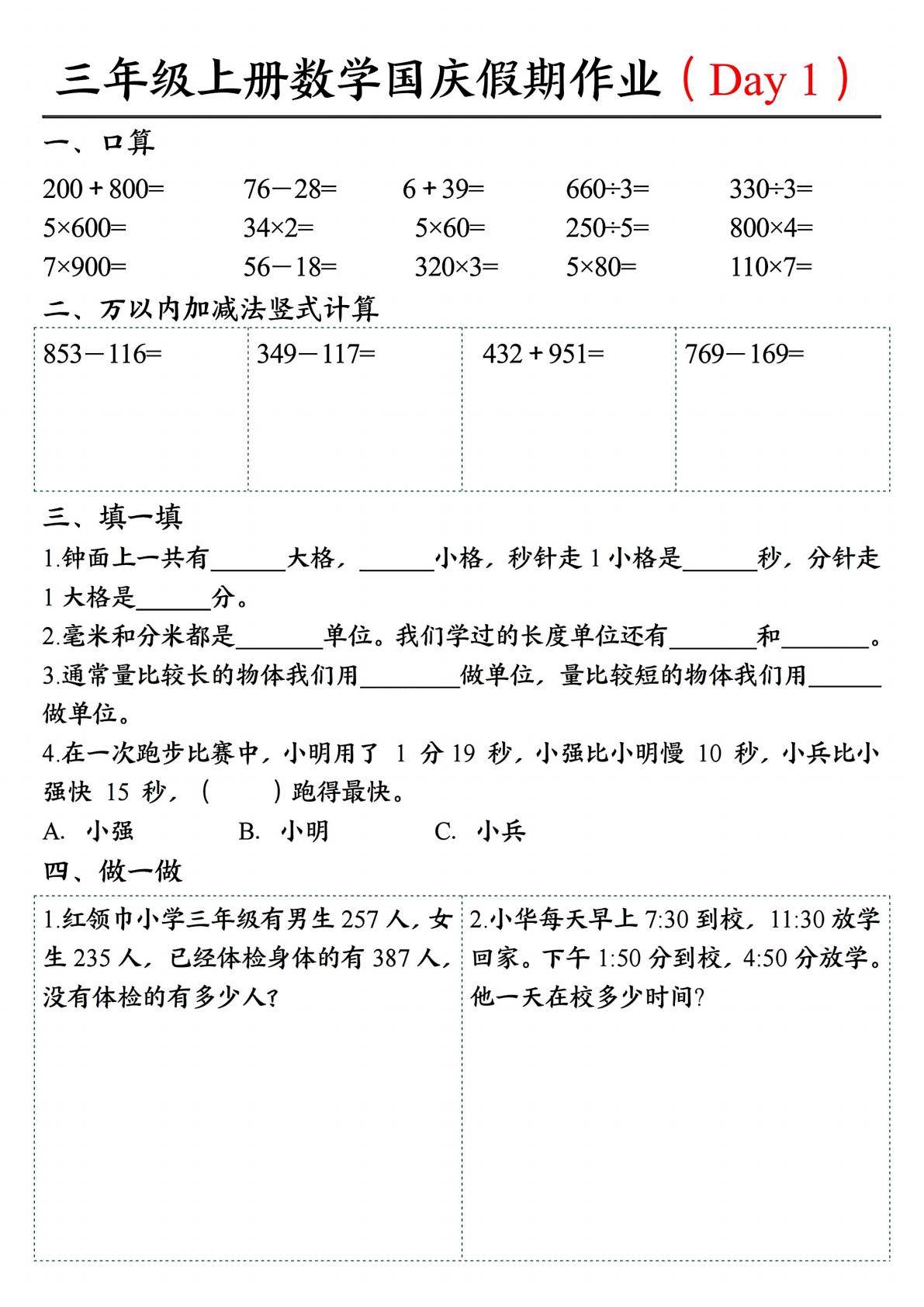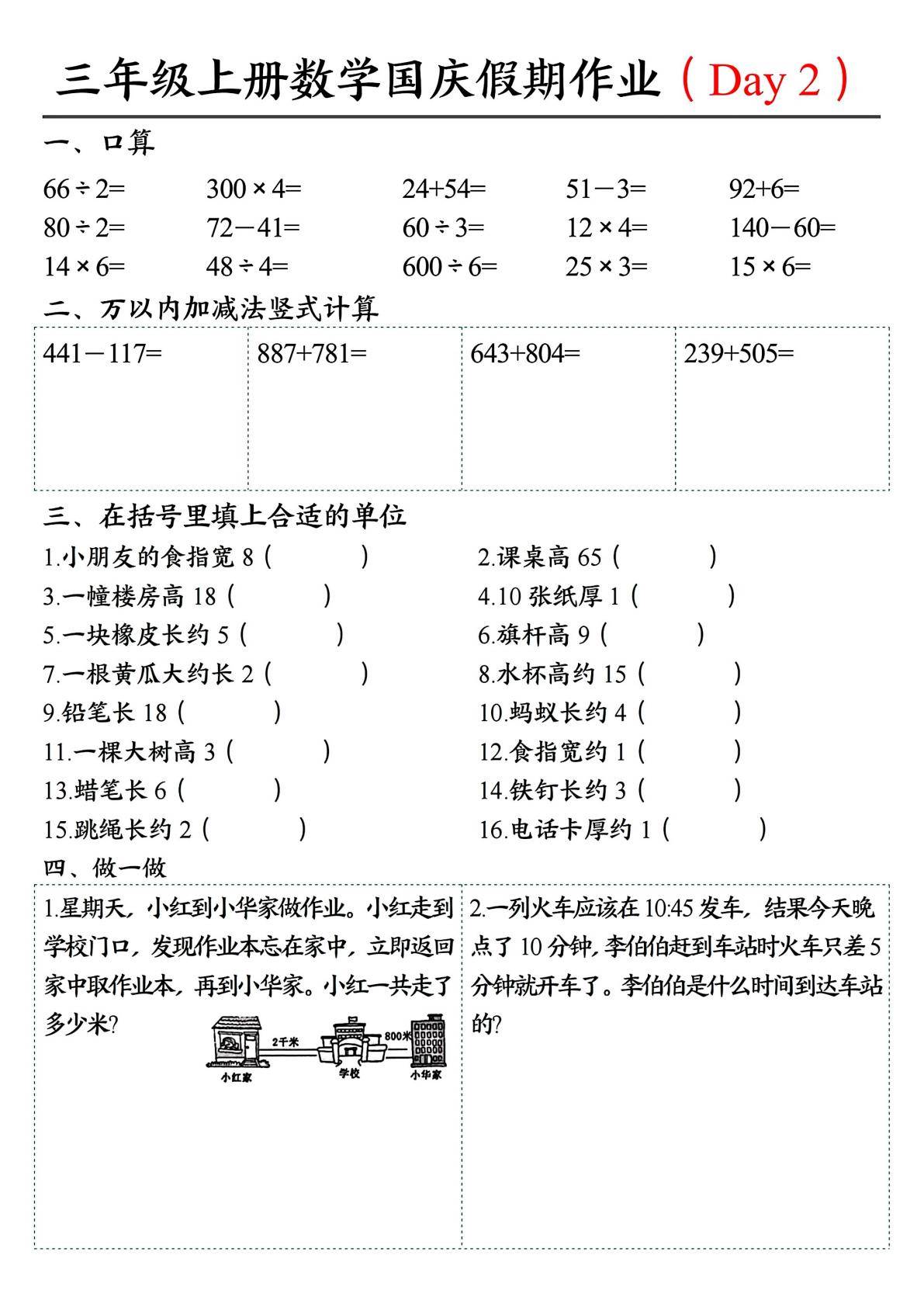 今天为大家分享:三年级上册数学国庆假期作业共7天,从知识内容来看,包含了口算、万以内加减法竖式计算、单位相关知识(如长度单位、时间单位)以及实际应用问题等方面。口算部分,涉及整数的加、减、乘、除运算,帮助学生提升基本运算的速度与准确性;万以内加减法竖式计算,着重训练学生的竖式运算能力,巩固加减法的计算规则;单位相关知识,既有长度单位(如米、分米、厘米、毫米)的认识与应用,也有时间单位(时分秒)的换算与理解。