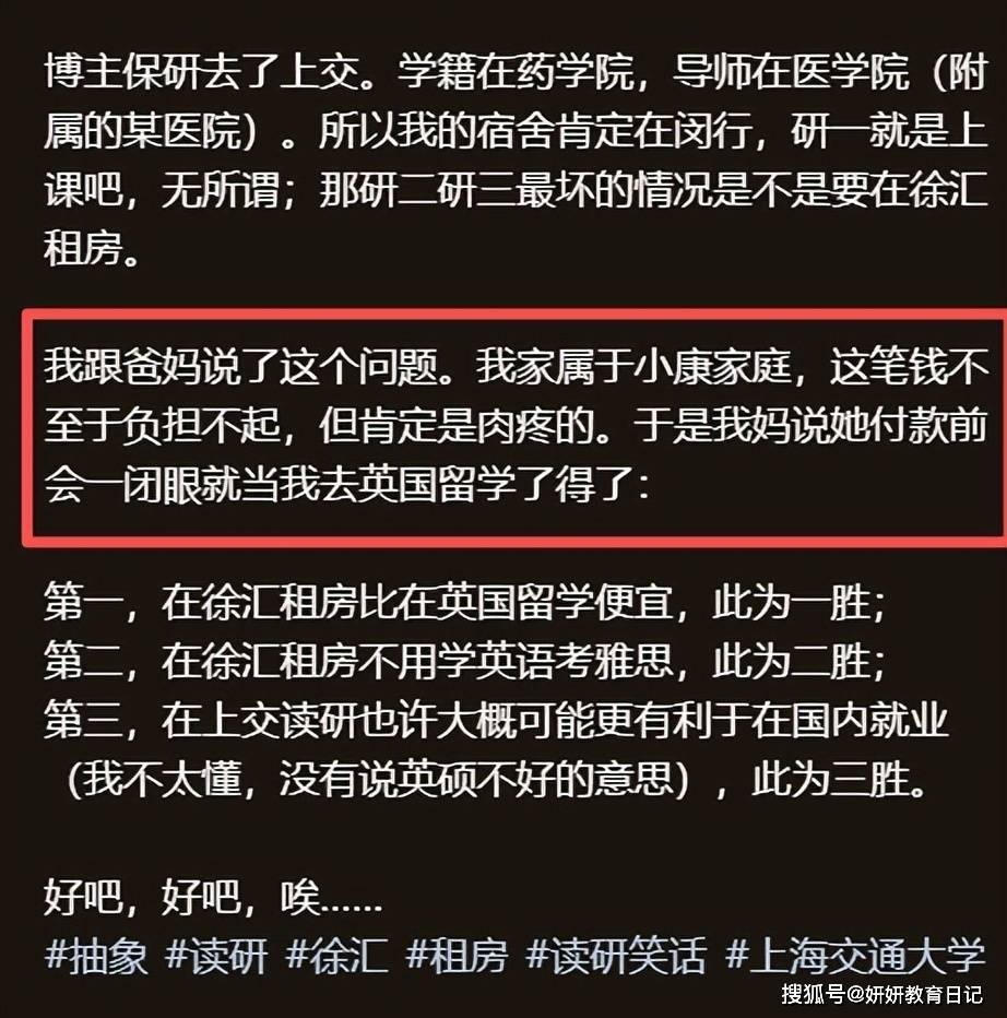 不过大家还是要认同一个事实,就是这位同学确实非常的优秀,哪怕他真的要在徐汇区租房,那也要比在英国留学更便宜。