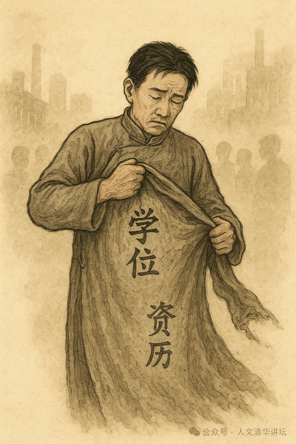 “孔乙己的长衫”出自鲁迅小说《孔乙己》,象征着一种尴尬的身份处境。近年来互联网话语体系中,这一句被引申为:学历、学位或文化资历是一件“脱不下的长衫”,指年轻人即便达到了教育上的“标准”,依然难以摆脱社会经济压力、就业不匹配或身份焦虑的困境。