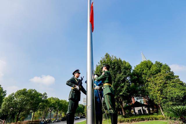 一旁的国旗护卫队格外引人注目——我校国旗护卫队与华政附高国旗护卫队队员并肩而立,他们身着整齐制服,眼神坚定如炬。“稳住步伐,注意摆臂高度。”升旗仪式开始前,我校国旗护卫队的学长拍拍附高学弟的肩膀,手把手调整他的姿势,耐心叮嘱动作要领,一同将鲜艳的五星红旗护送至旗杆下。当国旗迎着朝阳缓缓升空,红领巾与团徽、党徽交相辉映,赤诚的爱国心在国旗下交汇,在国歌中共鸣。这不仅是一次庄重的升旗仪式,更是一场生动的协同育人实践。