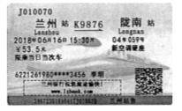 7.李明,你乘坐的兰州到陇南的K9876次列车于2018年6月16日15:30由兰州站开出,座位是4车厢59号,限乘当日当次车。