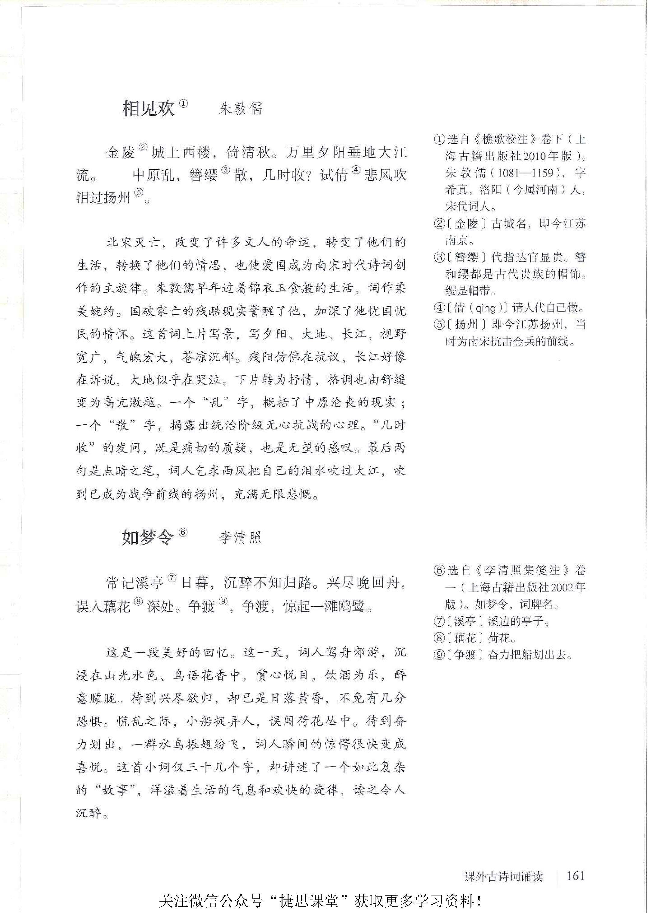 课外古诗词诵读:浣溪沙(一曲新词酒一杯)/ 晏殊、采桑子(轻舟短棹西湖好)/ 欧阳修、相见欢(金陵城上西楼)/ 朱敦儒、如梦令(常记溪亭日暮)/ 李清照